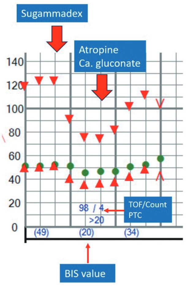 Red downward-pointing triangles represent systolic blood pressure (SBP), red upward-pointing triangles indicate diastolic blood pressure (DBP), and green circles represent heart rate (HR). After administration of sugammadex, neuromuscular monitoring showed a train-of-four (TOF) ratio of 98% with a count of 4 and a post-tetanic count (PTC) > 20, indicating successful recovery from neuromuscular blockade. However, a significant hemodynamic disturbance occurred, with bradycardia and concomitant decreases in both SBP and DBP. Atropine and calcium gluconate were subsequently administered to manage the hemodynamic instability. The Bispectral index (BIS) value remained around 20 during this episode.