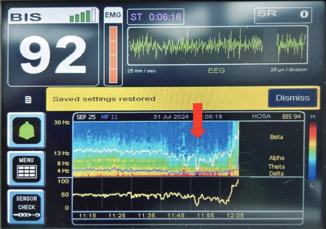 The patient experienced shock following sugammadex administration. Concurrent monitoring revealed a diminished BIS value with burst-suppression patterns. Furthermore, DSA indicated alpha-wave suppression alongside delta-wave augmentation. The EEG signal attenuation was evidenced by reduced SEF and MF values. A burst suppression pattern on the EEG signifies a substantial reduction in neuronal activity, potentially caused by cerebral hypoperfusion. Cerebral hypoperfusion, referring to diminished blood flow to the brain, can cause numerous neurological impairments. Xu et al. 1 reported that an extended cumulative duration of intraoperative burst suppression may increase the risk of postoperative delirium. In line with our findings, a previous study suggested a connection between brain hypoperfusion and the loss of alpha alongside delta arousal in DSA in a patient experiencing hypovolemic shock. 2 Wu et al. 3 found that a larger infarct volume was linked to increased delta power, and EEG showed a strong correlation with acute stroke behavioral deficits. Furthermore, patients with corticosubcortical ischemic stroke exhibited higher delta power and lower alpha power than those with subcortical ischemic stroke. 4 To summarize, EEG and DSA may be valuable tools for identifying cerebral ischemia and predicting patient outcomes.